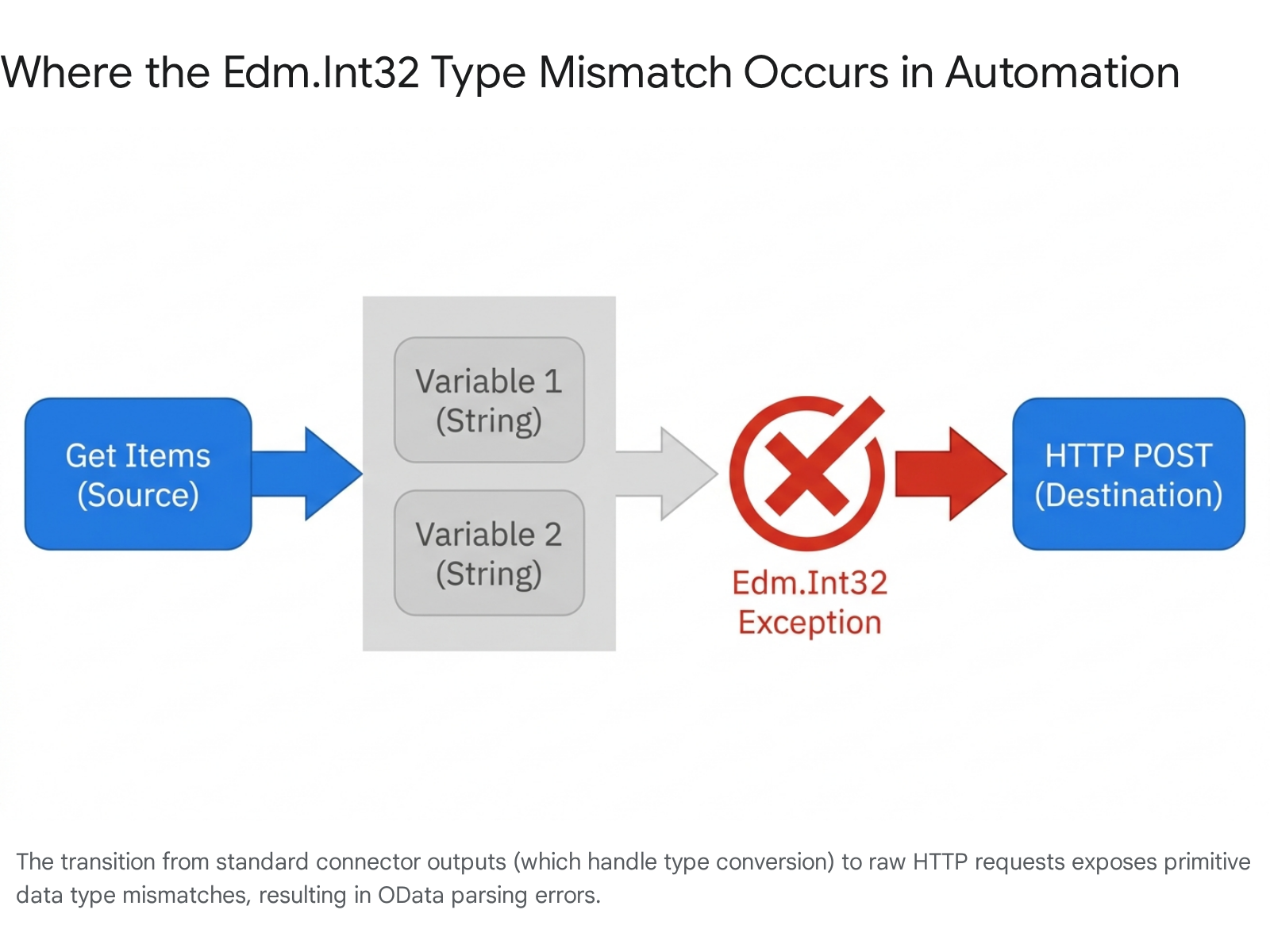 In February 2025, user Beth Beck described a scenario in the Collab365 forum that perfectly encapsulates this problem.13 She built a Power Automate flow triggered by a list form submission. The flow successfully created a new dynamic list in another site, copied the column schema, and fetched the source items. But it failed on the final HTTP request to populate the new list. The error log was brutal and opaque: Cannot convert a primitive value to the expected type 'Edm.Int32'.13