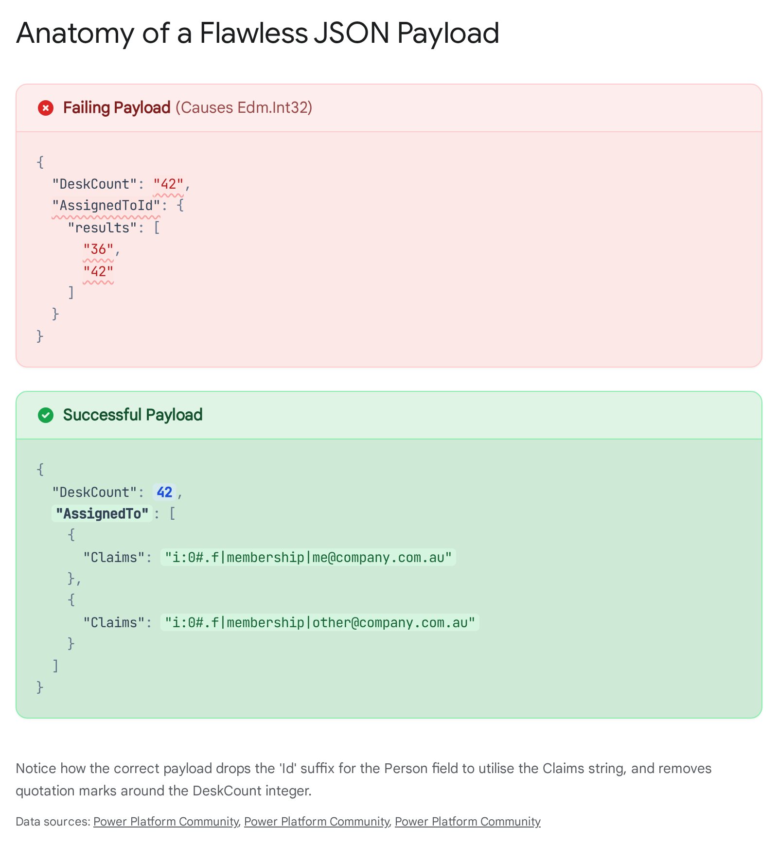Her screenshots showed the HTTP body passing fields like "Desk Count" (a number field) and "Person/Group" (using an email address).13 The thread initially suspected the number field was the culprit, but quickly narrowed the focus to the Person fields. As community member James Williams pointed out, when you use the SharePoint REST API /items endpoint to post a person field, the system expects the numeric ID of that user from the hidden User Information List.13
