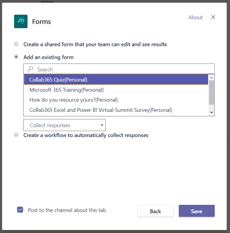 For our example, we select the middle option to add an existing Form, which will be the quiz we just created in Forms. Choose it from the list, and then use the drop-down below it if you want the responses collected in Forms for you to review or shown in the Teams Conversation feed for all to see.