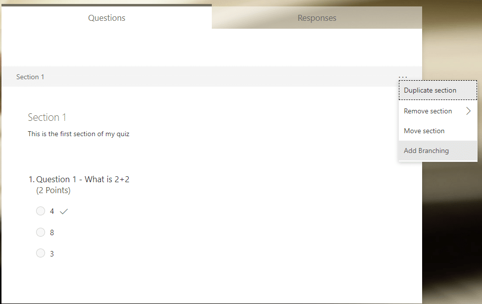 You can add different sections to your quiz to give it structure. Once you have different sections, you can add branching by clicking the ‘…’ menu at the section’s top right. Branching allows for a vibrant Survey and Quiz experience.