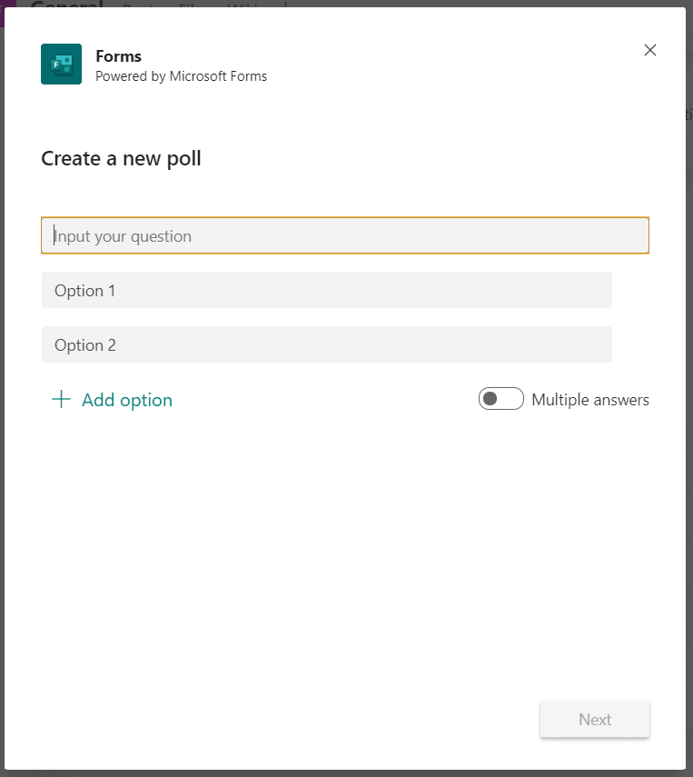 Doing this will open a pop-up window where you can create your poll, you can add options and also allow multiple answers. Once your poll is ready, click ‘Next’ to preview it and then publish your Poll to the conversation feed.