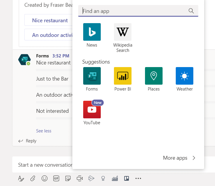 The second method to create a poll showing up in the conversation feed is by selecting the ‘…’ more options from the conversation window, and selecting ‘Forms.’