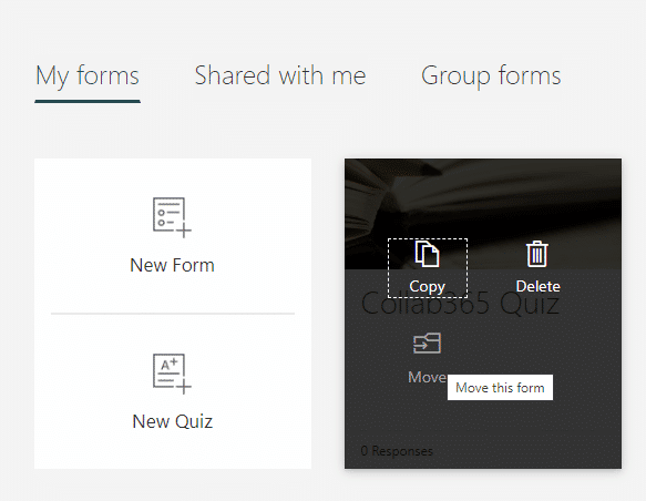 If you want all members of your Teams, Team to become owners (so they can edit and review results), you can move the Form to the relevant Group of that Team. To do this, go to the home page in Forms, click the ‘…’ menu on your quiz, and choose the ‘Move’ option: