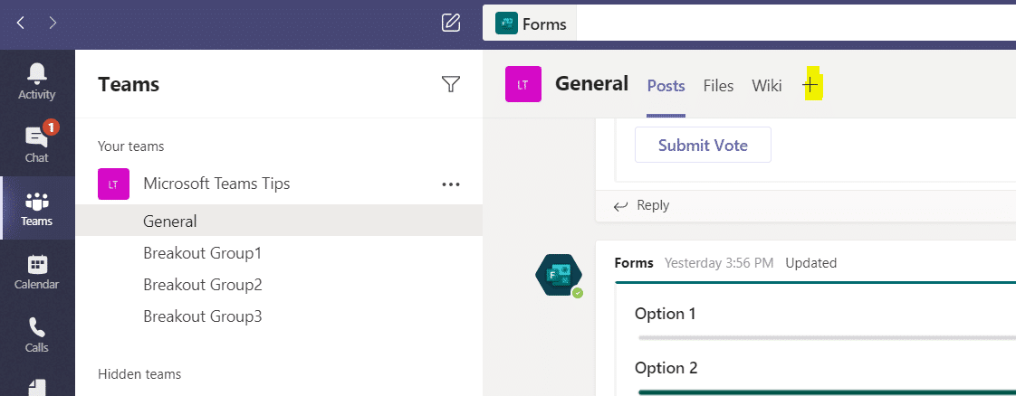 In my example, we are adding the quiz to the General Channel of our team. However, it could be added to any of the channels in your team. Select your channel and click the ‘+’ button to add a tab.
