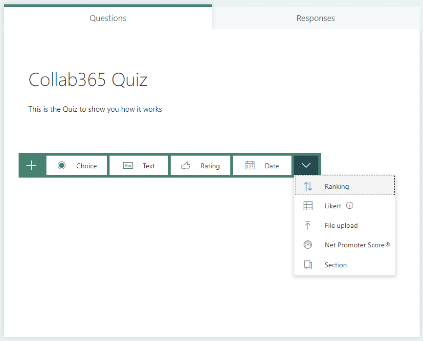 You will now be presented with a few options; you could have started here and created a quiz from the Teams tab by selecting the top option. This a great way to collaborate on surveys or quizzes with your team.