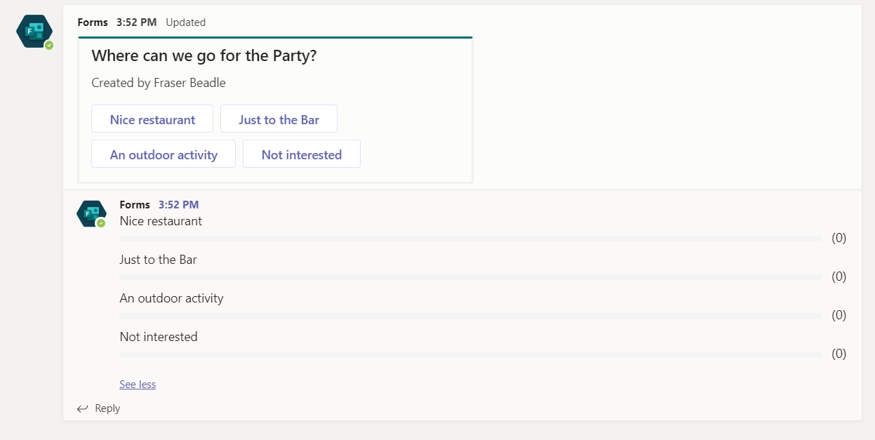 As people answer your poll, the results will be shown ‘live’ in the conversation feed below the question. You can also open the complete Forms application and view the poll along with the results. However, it’s worth noting that you can’t edit the quick poll.