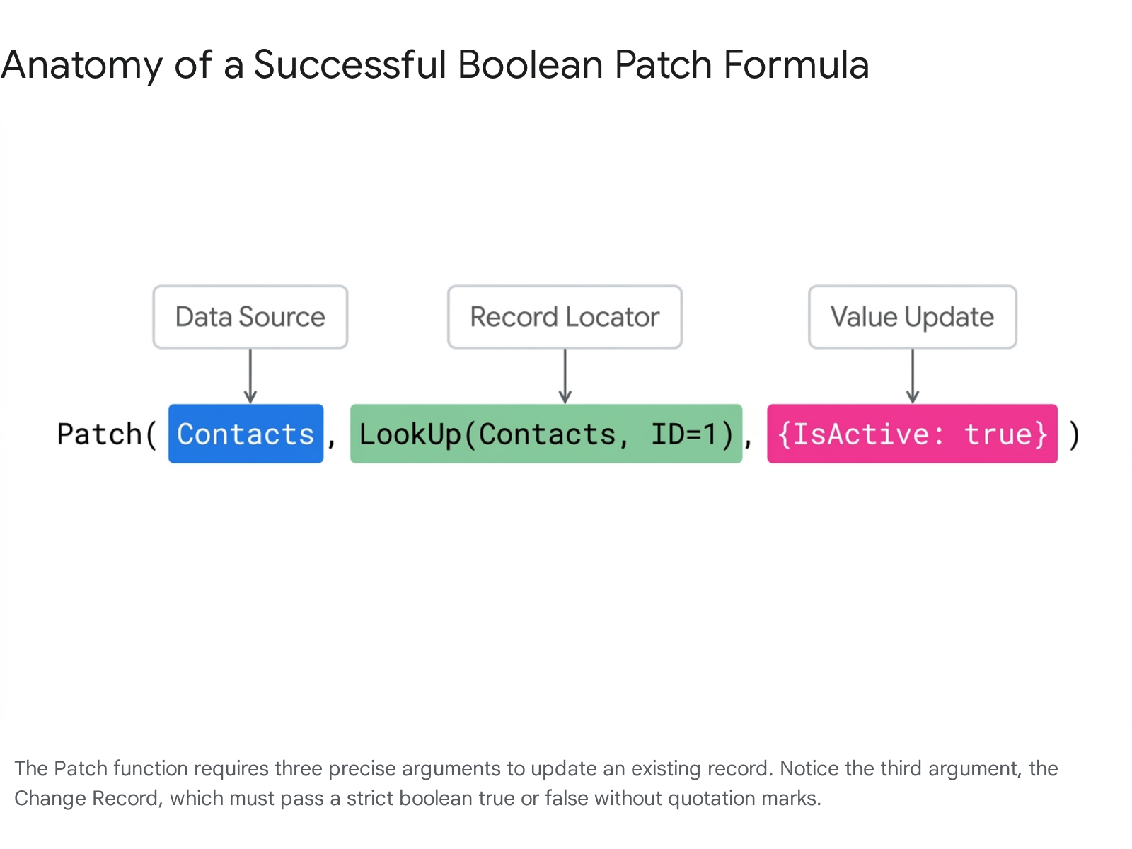 If you attempt to write Patch(MySharePointList, BaseRecord, {IsActive: 1}), the compiler will throw an error. If you find yourself in a situation where your input data is text-based (for example, reading from an Excel file or a legacy text input), you must explicitly cast it. Power Apps provides the Boolean() function for this exact scenario. Writing Boolean("true") will successfully convert the text string into a native logical boolean that Patch will accept.10