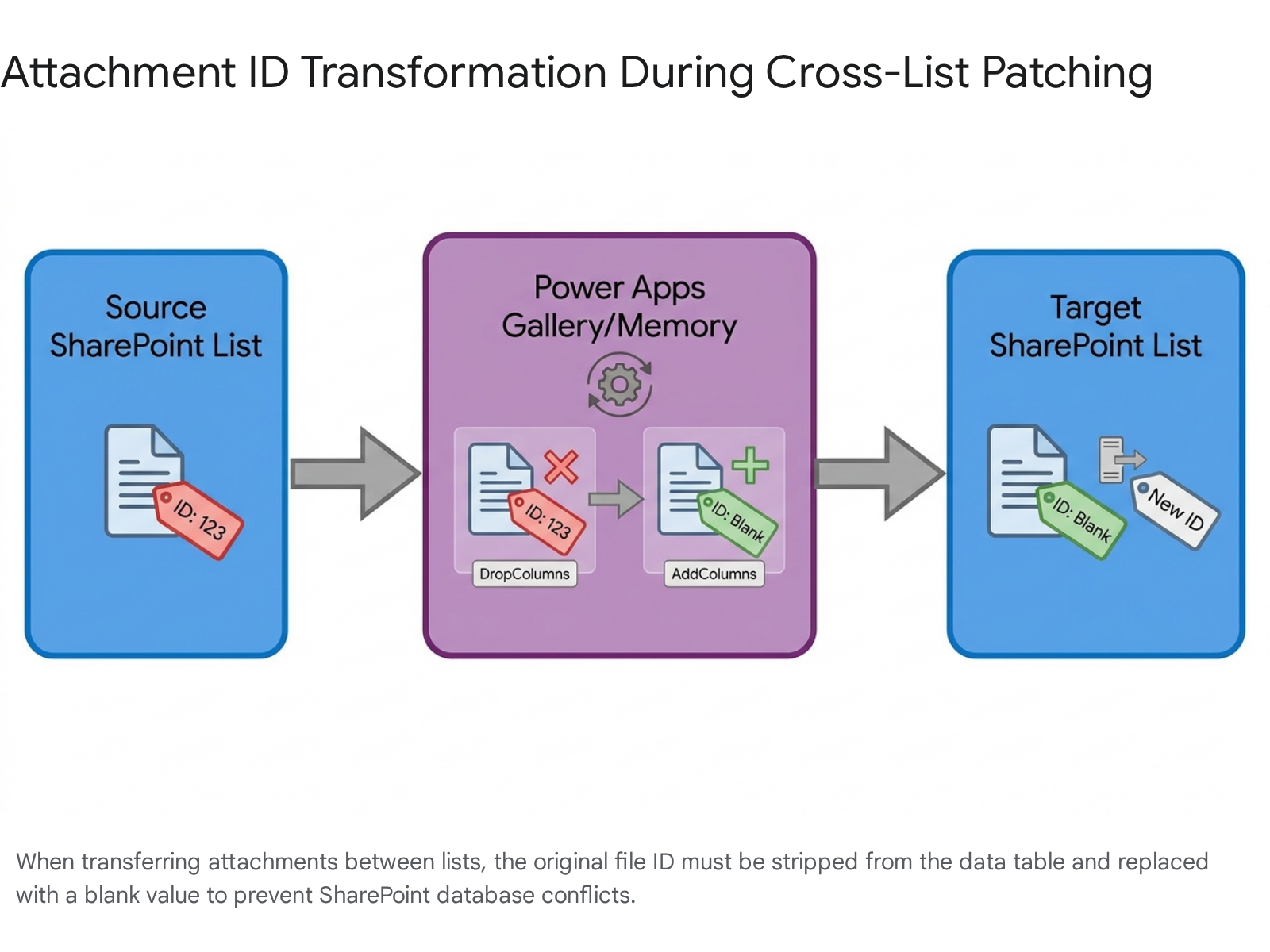 What if the attachments already have IDs? Attachments in an existing SharePoint list will always have IDs generated by the server. This is exactly why the DropColumns(Attachments, "Id") step is absolutely non-negotiable.1 Attempting to migrate them with their original IDs guarantees a failure, as the database sees a conflict.