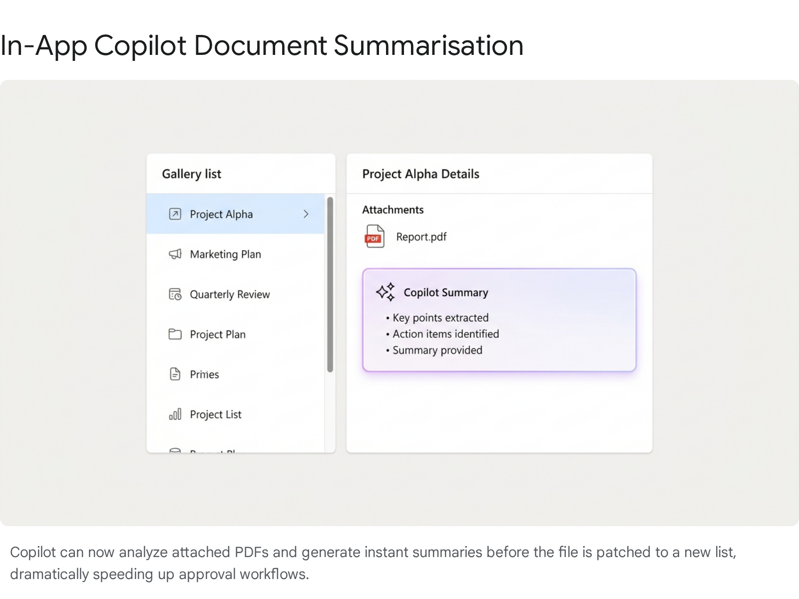 When users attach documents via the gallery in modern canvas apps, Copilot can perform real-time file analysis. Developers can now allow users to select a file in a OneDrive or SharePoint-backed gallery and generate an immediate summary of the document without ever opening it.28
