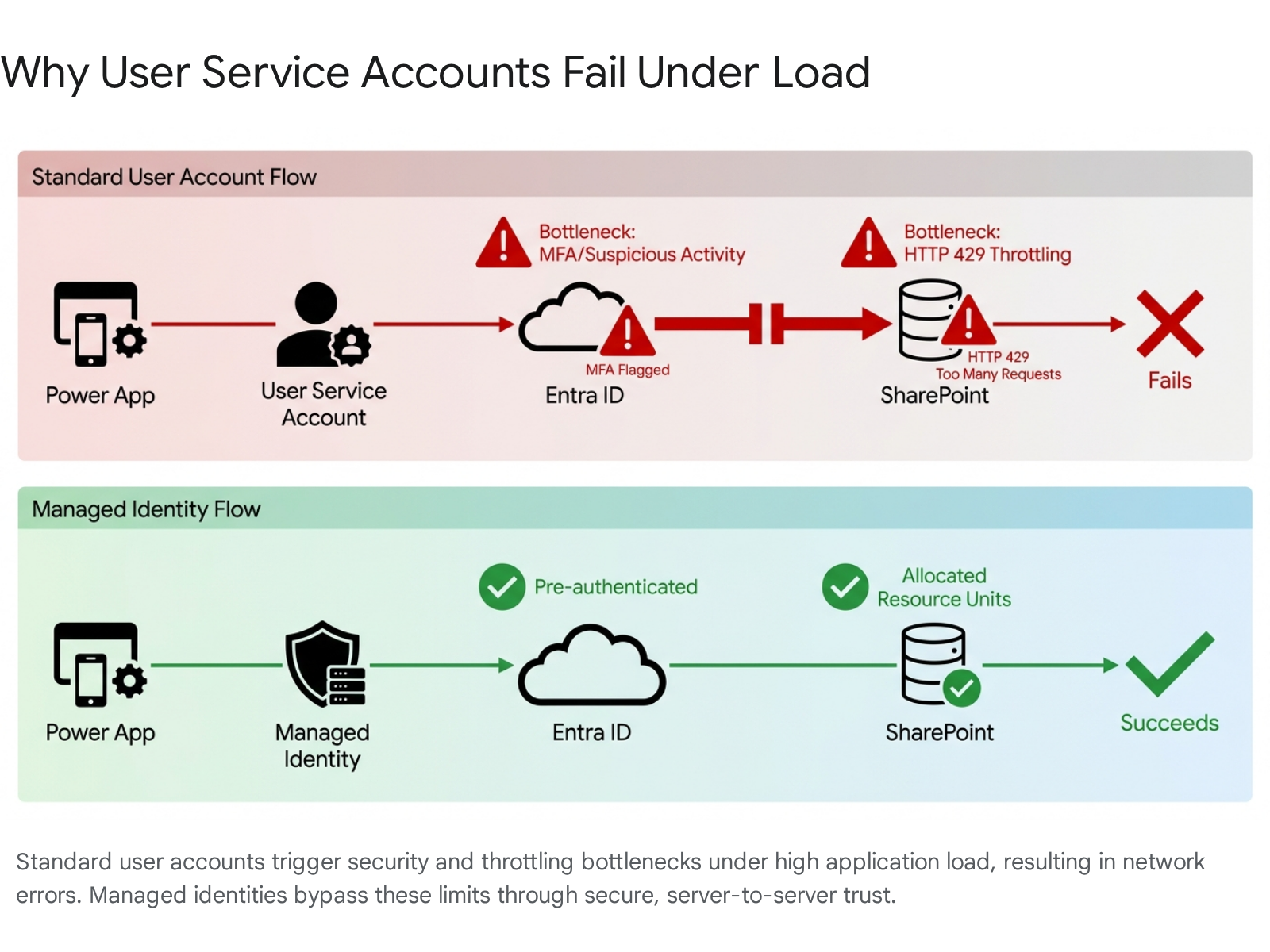 Can user service accounts still work? Technically, yes, but only if your tenant admin specifically excludes that account from your company's Conditional Access and MFA policies. We highly advise against this. Leaving an account without MFA is a massive security hole. Also, user accounts have very low adaptive throttling limits. As your app gets busier, the network timeout errors will definitely come back.3
