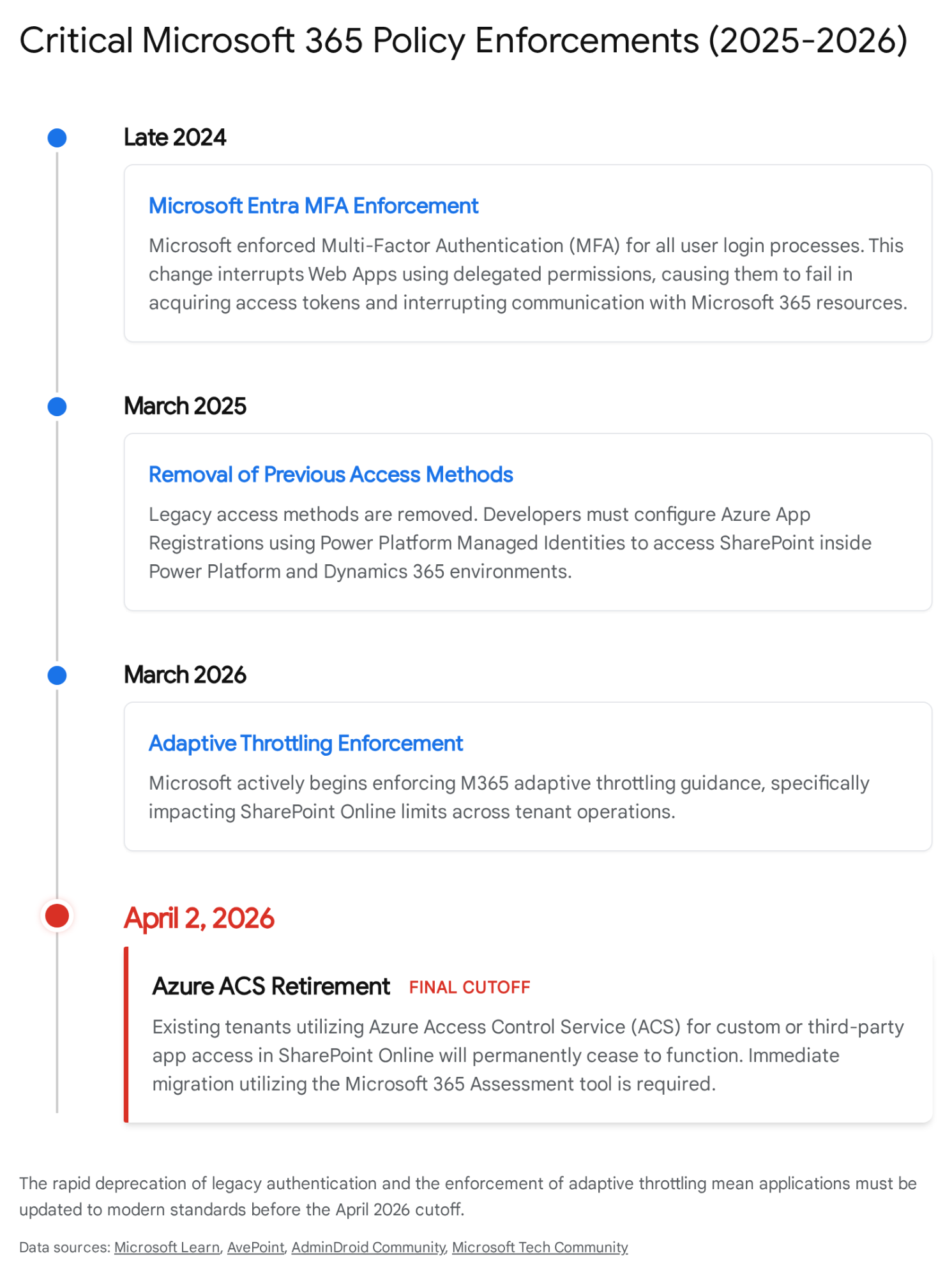 The rules for Microsoft 365 authentication changed recently. We need to look at the new 2026 landscape. After April 2, 2026, existing tenants using the legacy Azure Access Control Service (ACS) for custom app access in SharePoint Online will stop working entirely.11 Microsoft is retiring it. Admins must use the Microsoft 365 Assessment tool to scan their setups and migrate away from these old systems now.11