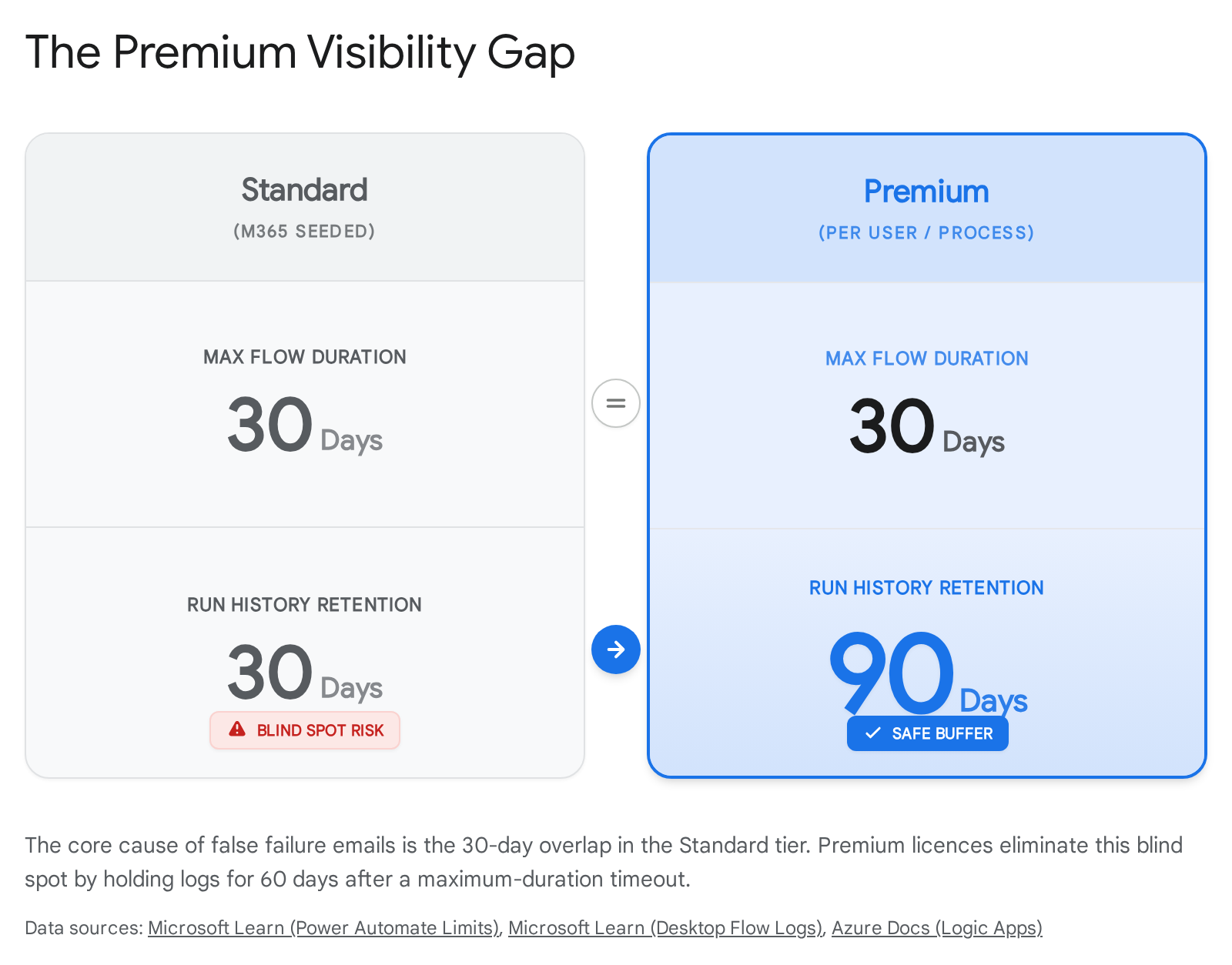 Key Takeaway: If your business operations depend on workflows that routinely take more than a month to complete, upgrading to a Premium licence for 90-day retention is often cheaper than the hours spent troubleshooting invisible errors.