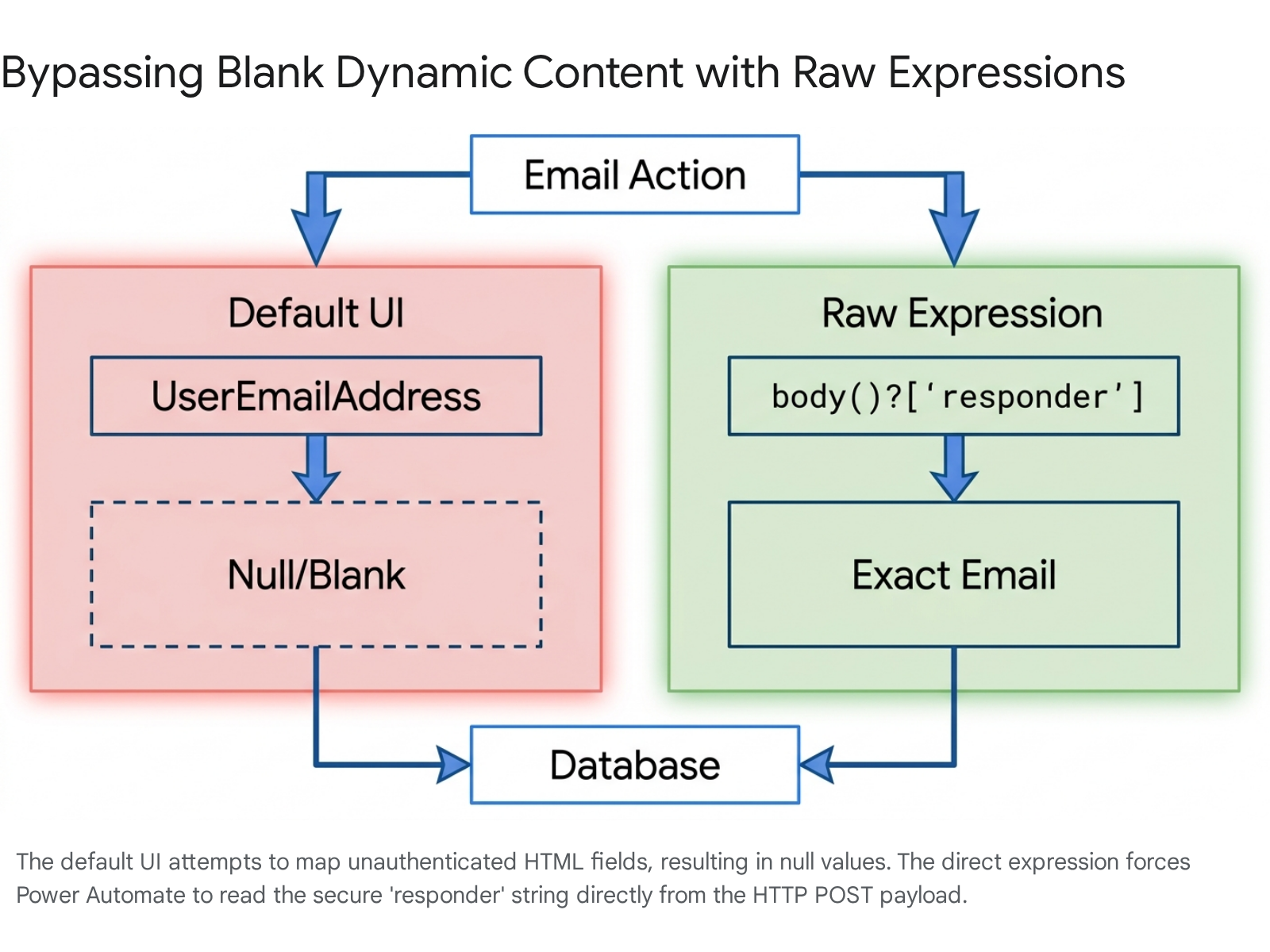 3. Can I use the UserEmailAddress dynamic content at all? In highly specific, plain-text internal scenarios, it sometimes populates correctly. However, due to the inconsistent rendering of HTML messages across different versions of Outlook (desktop, web, mobile), it is considered highly unreliable in production environments. Always use the body('Send_email_with_options')?['responder'] expression for guaranteed extraction.3