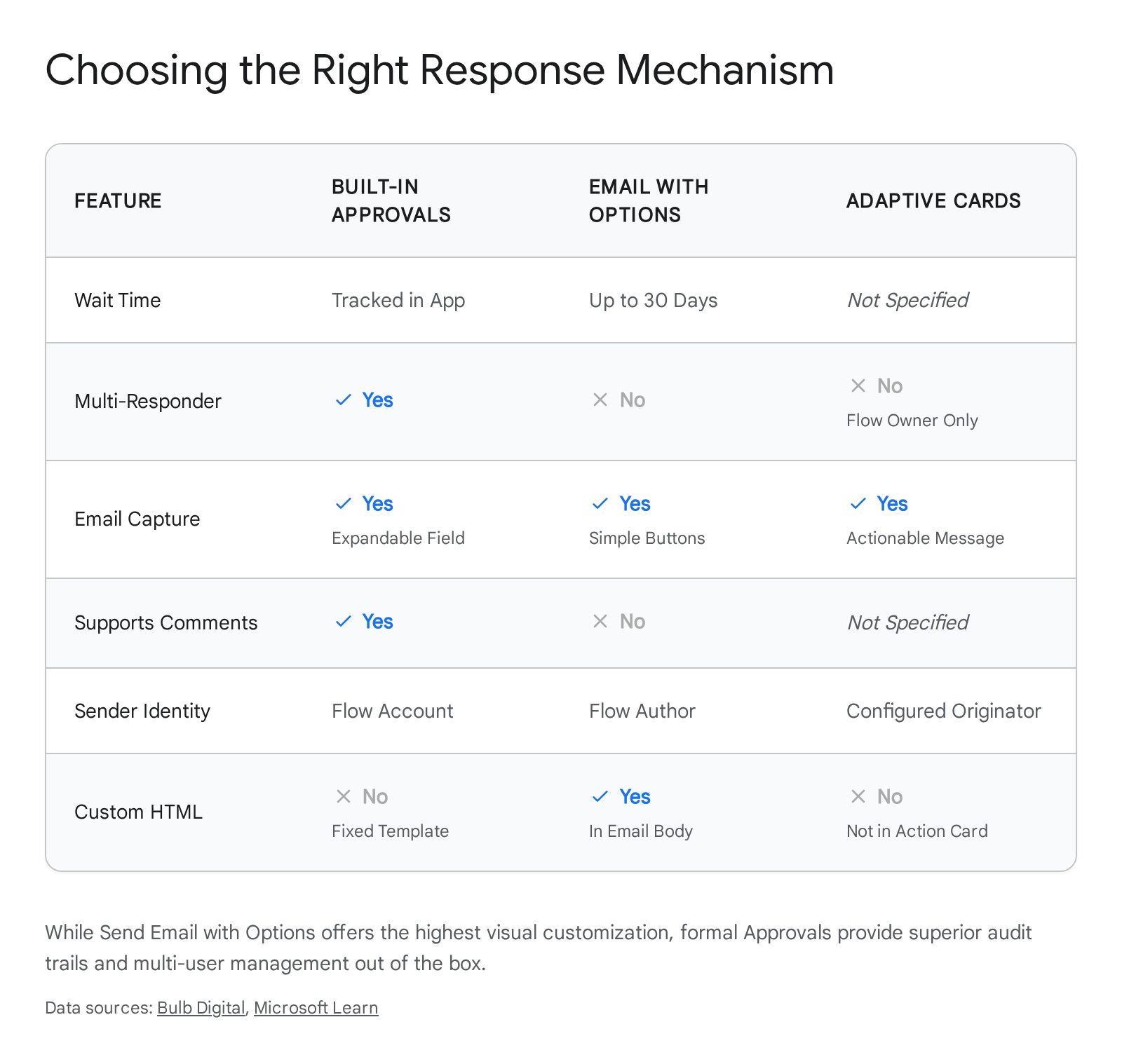 Key Takeaway: If your business process requires the responder to type a justification, reason, or comment alongside their decision, you must use Approvals or Adaptive Cards. Email with Options only supports static button clicks.