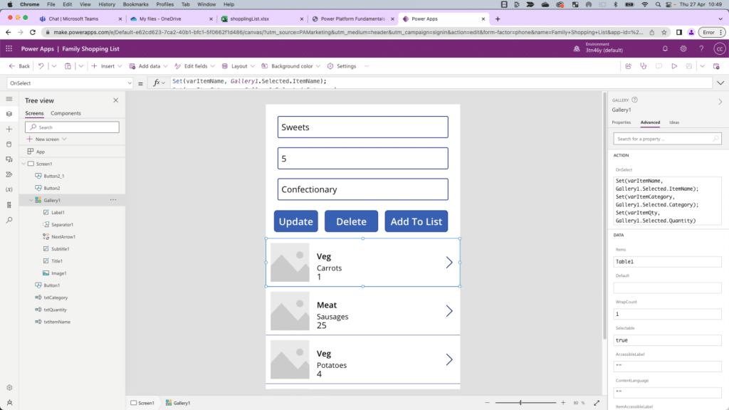 - In Power Apps, open your family shopping list app