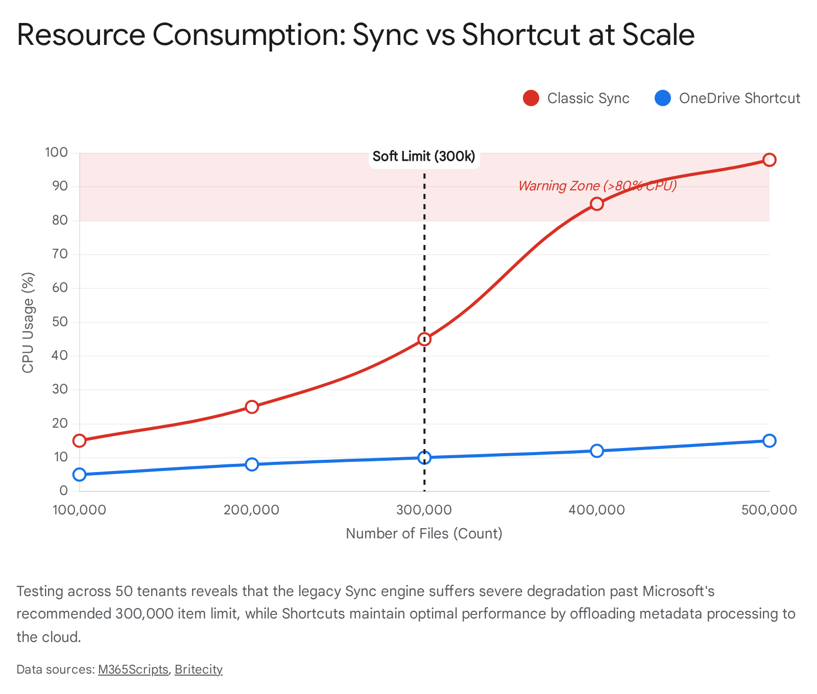 Shortcuts handle metadata far more gracefully. By nesting the link within the existing OneDrive architecture, it drastically reduces the polling overhead on the local CPU. While Microsoft still advises caution around the 300,000 file soft limit, the technical architecture of Shortcuts allows them to manage up to 500,000 items across files and folders with far fewer penalties than Classic Sync.10