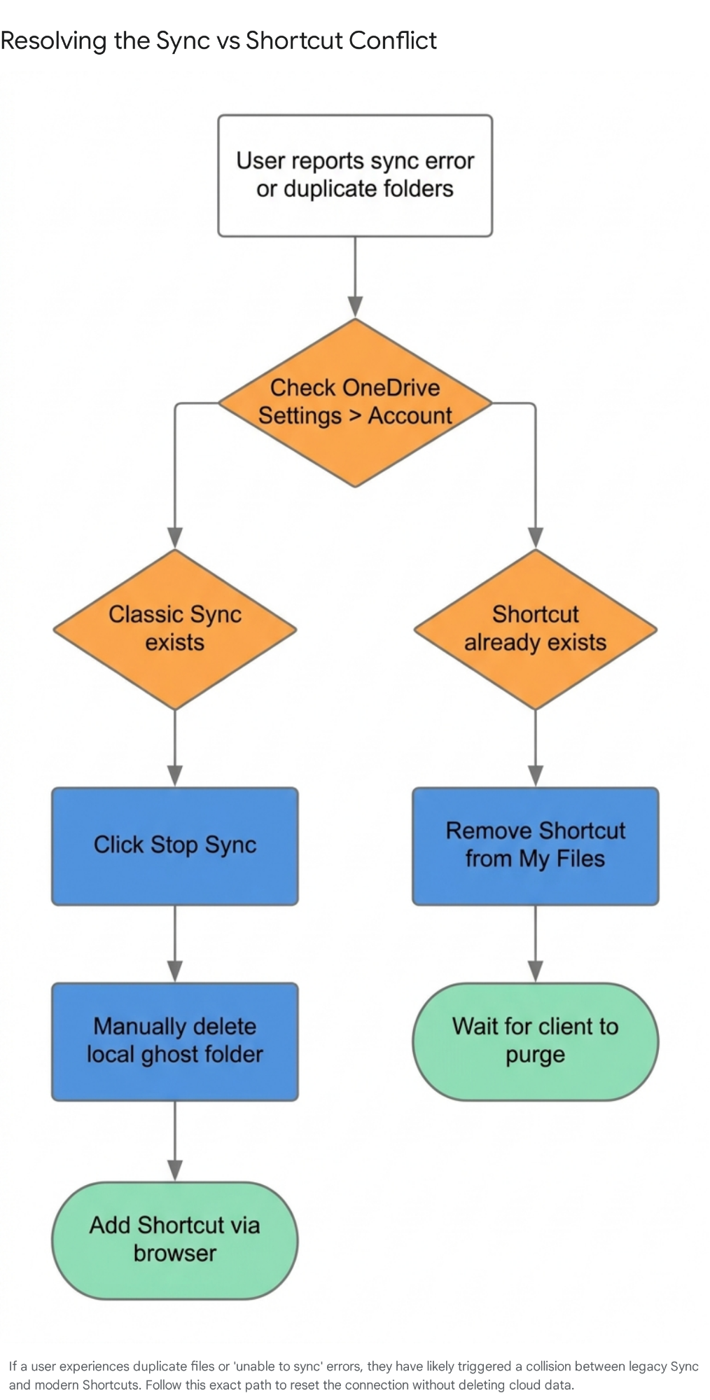Key Takeaway: You cannot use both Sync and Shortcut on the exact same document library. Attempting to do so will create immediate sync conflicts and duplicate file errors in the OneDrive client.10