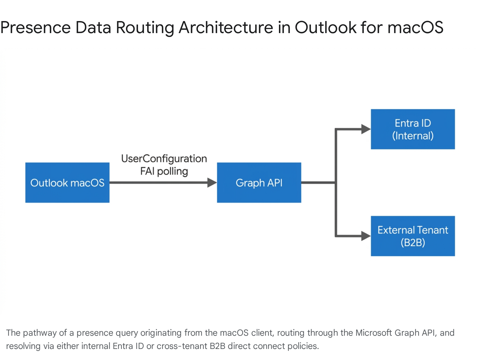 This API reads hidden MAPI items known as Folder Associated Items (FAIs).4 These hidden folders store persistent application settings, including real-time presence data aggregated from all the recipient's devices.4 When you type an email address into Outlook for macOS, the app triggers a background request.