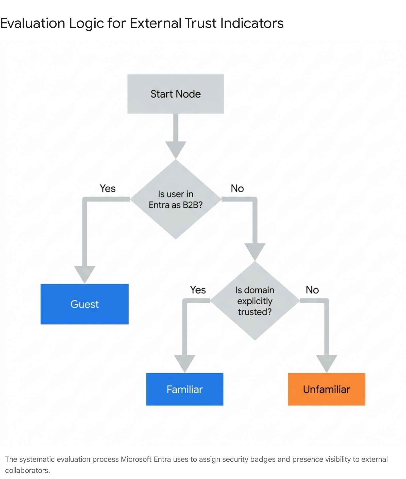 In February 2026, Microsoft Teams introduced sophisticated Trust Indicator badges to categorise external users, significantly altering how presence is perceived.11 When Outlook polls for presence, the system evaluates the external user's relationship against your organisation's security policies.