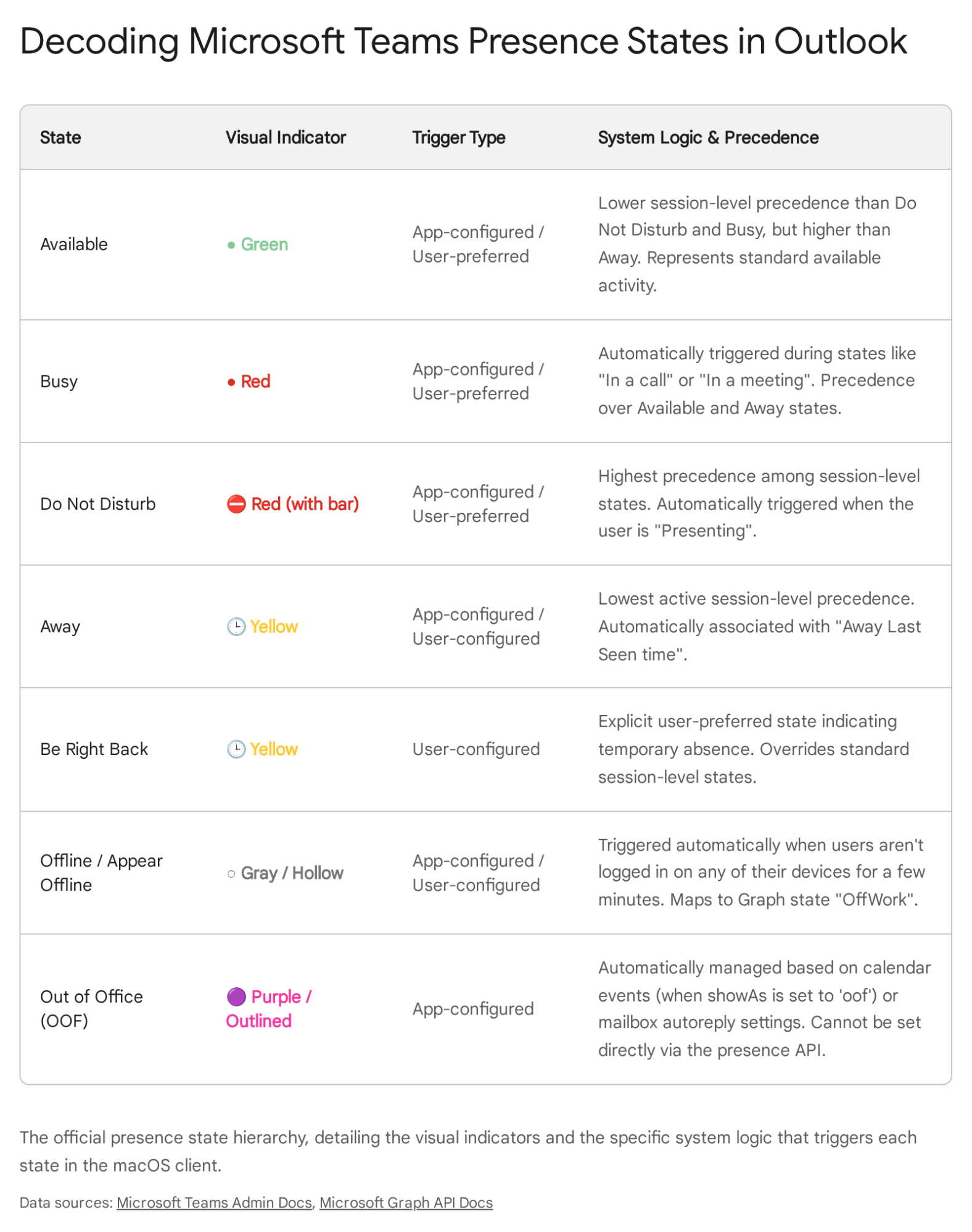 Key Takeaway: The system merges data from every device you are logged into. If you leave your Teams app open on your phone while working on your Mac, the Graph API combines those signals to calculate your final status.