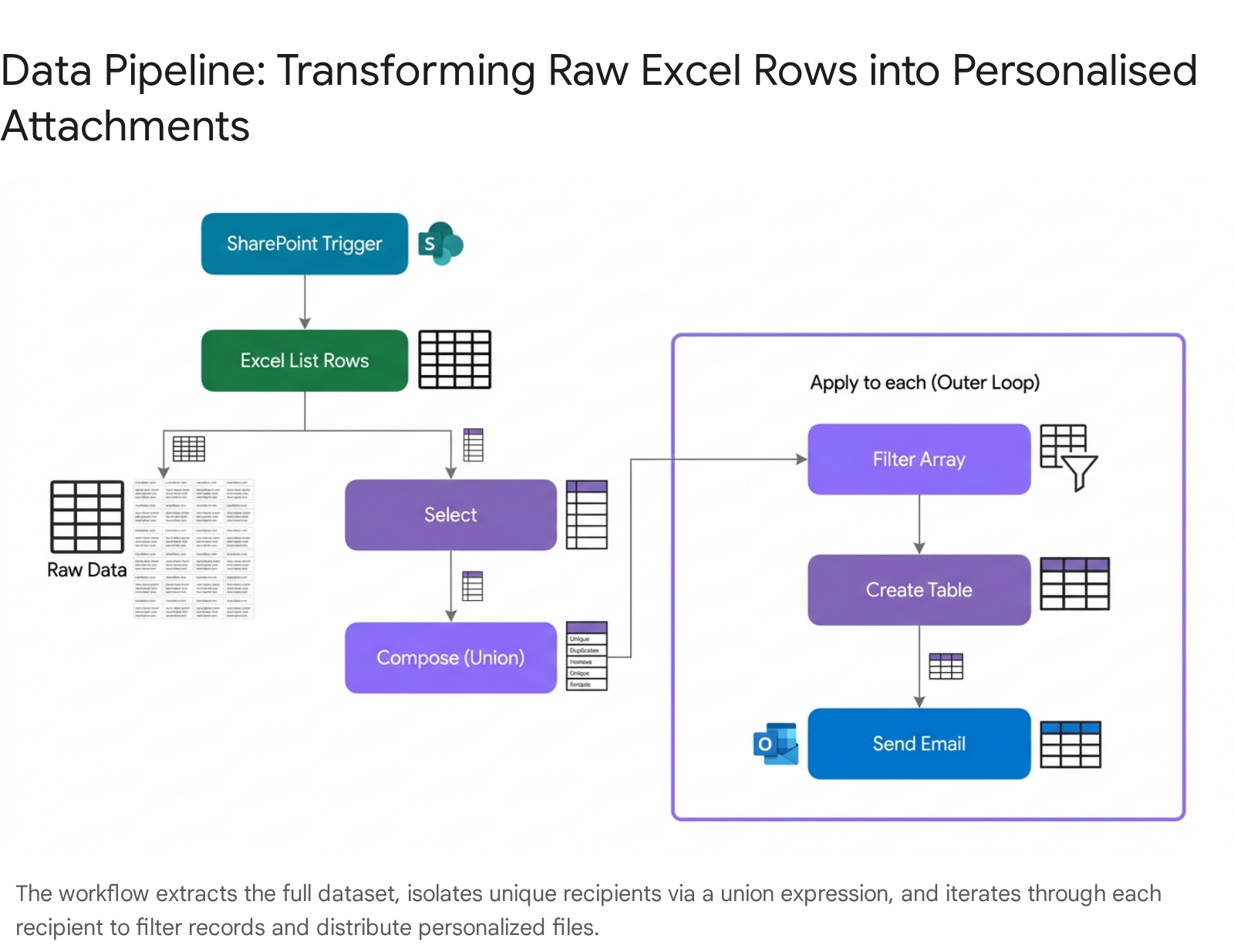 This comprehensive guide is engineered for analytics translators, SharePoint administrators, or Power Automate developers with intermediate experience.6 You are the sort of professional who understands basic cloud flows, JSON arrays, and Power Query syntax, but you need an optimised solution to automate personalised report distribution. Manual grouping, filtering, and emailing wastes significant administrative hours weekly. We understand the pain of copying and pasting rows into fifty different emails every Monday morning.7
