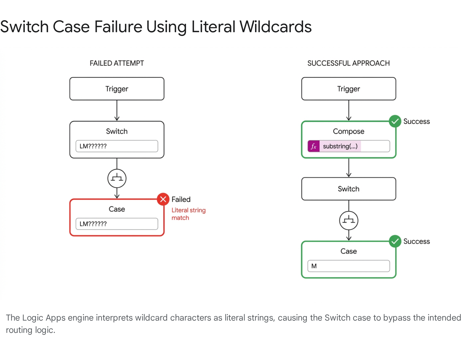 Key Takeaway: The Logic Apps engine evaluates Switch cases using strict equality operators. Attempting to use SQL-style or Excel-style wildcards will always result in a false evaluation.