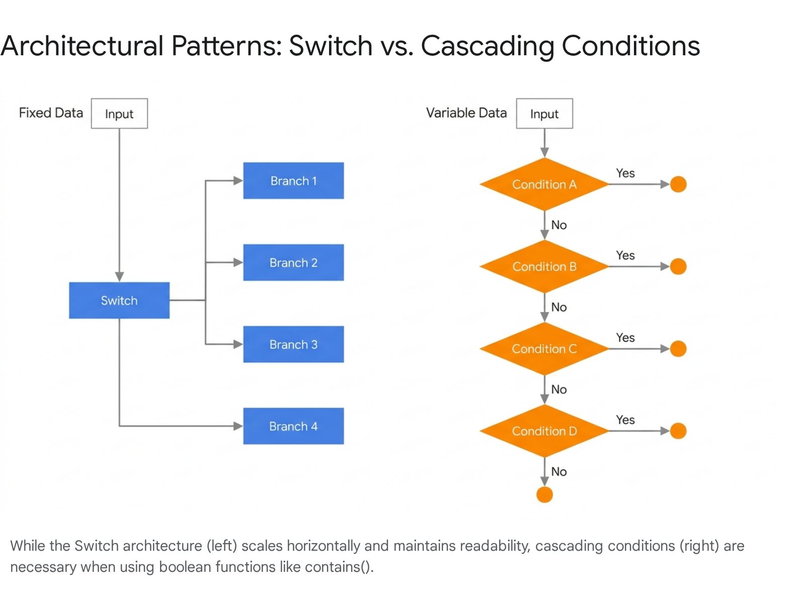 - (3) contains() for simple checks: For scenarios where the pattern position is not fixed, replacing the Switch with a Condition array using contains() or startsWith() provides a highly efficient alternative.3